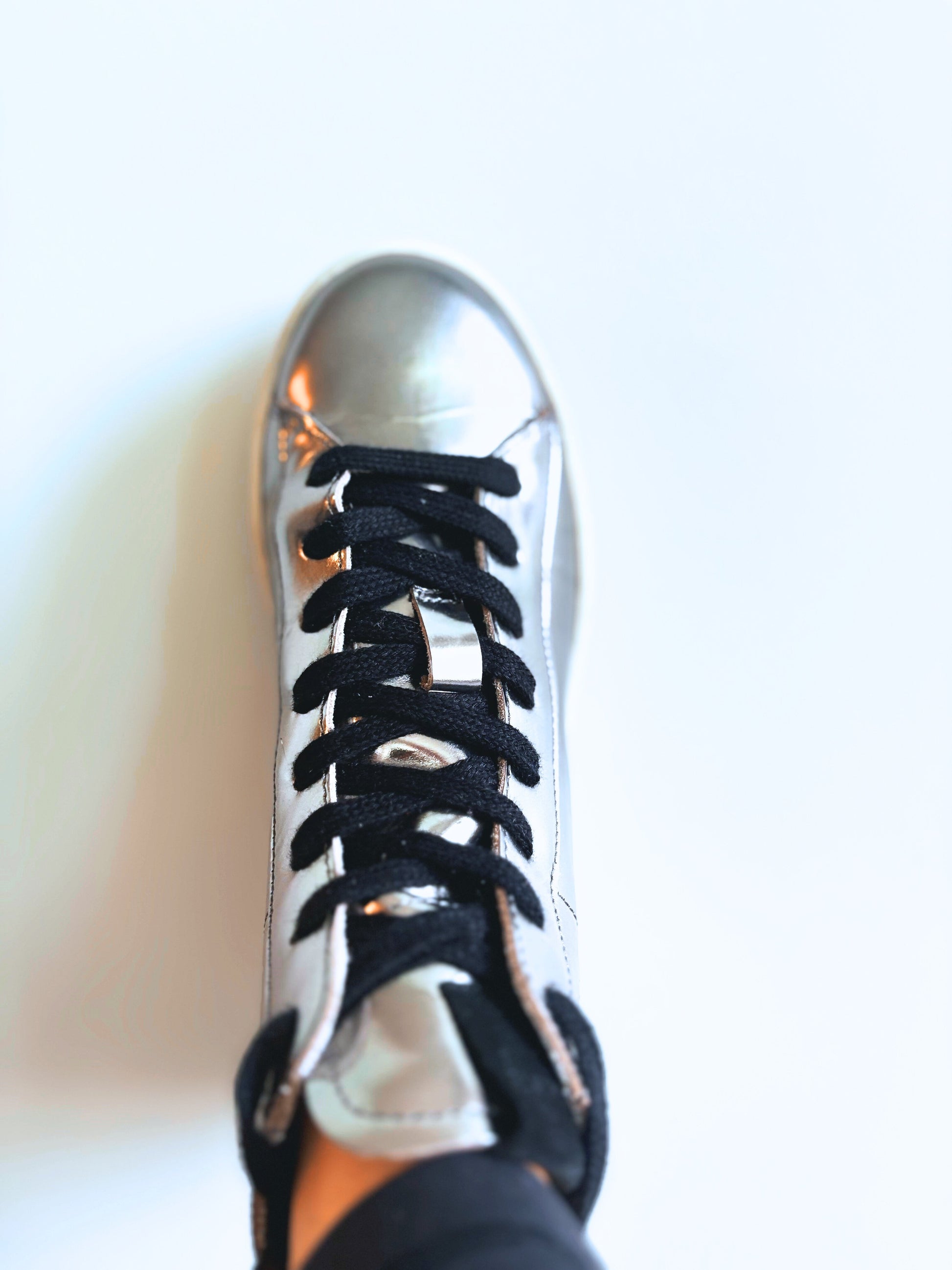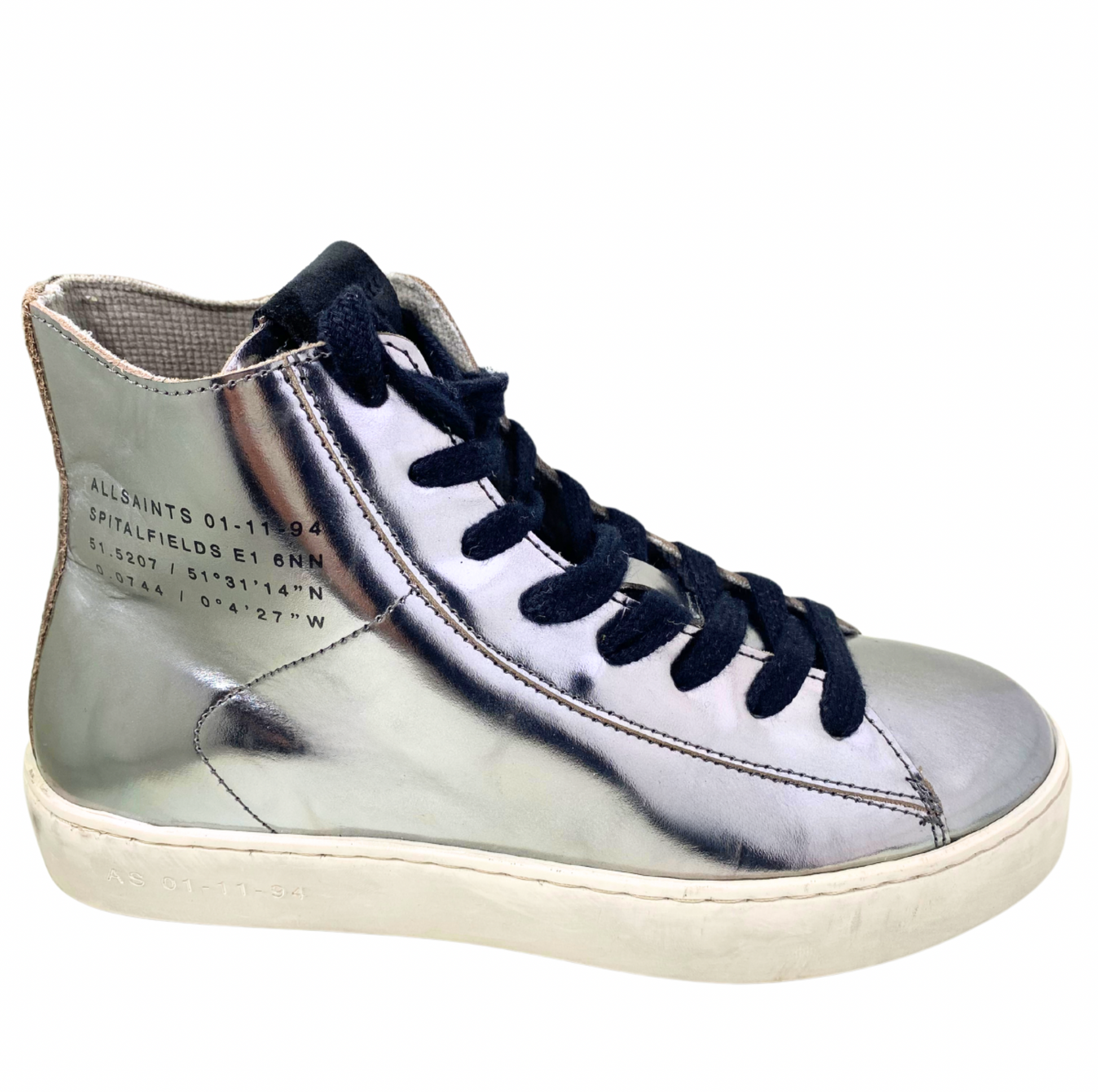 Brand new All Saints Tana high tops in silver leather. White rubber platform sole. Made in Portugal. AllSaints embossed 01-11-94 signature at side panel.