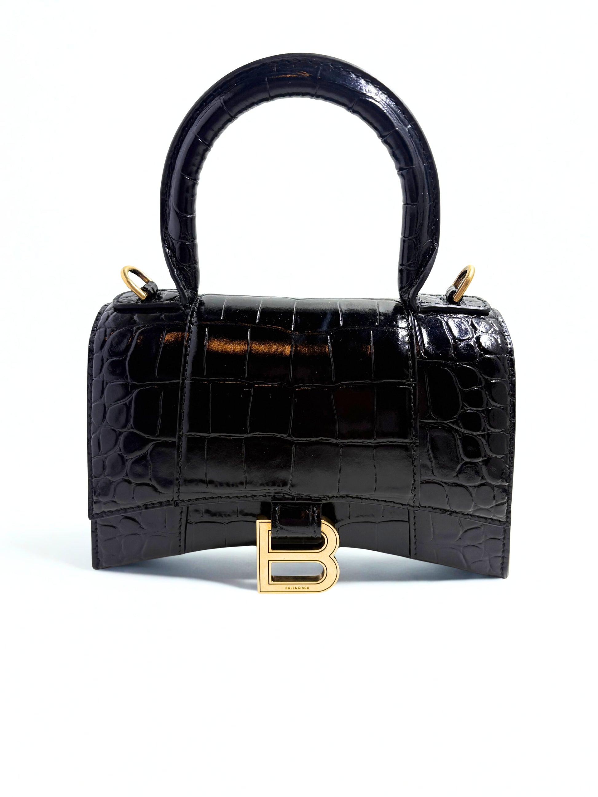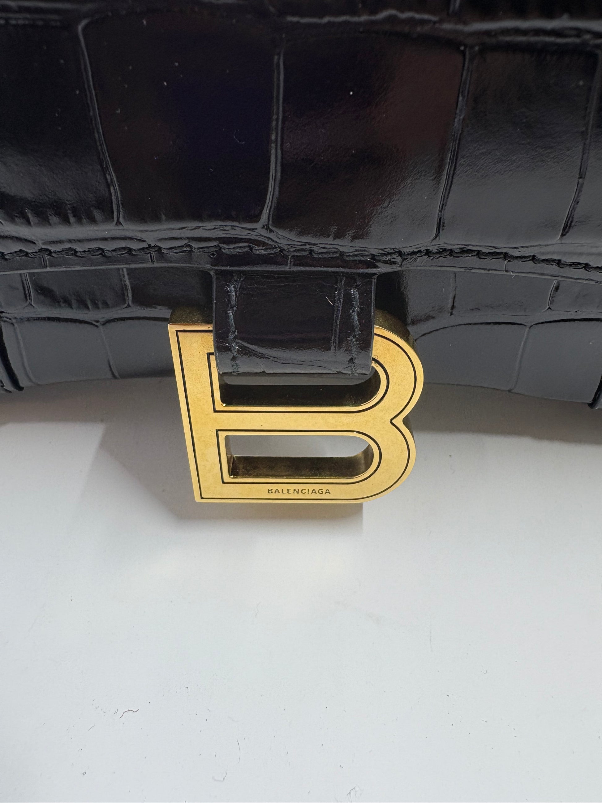 Make a statement with this Balenciaga Hourglass bag in black crocodile embossed calfskin and aged-gold hardware. Designed with the iconic sculptural silhouette, it features a structured top handle and a detachable crossbody strap for effortless day-to-night versatility.