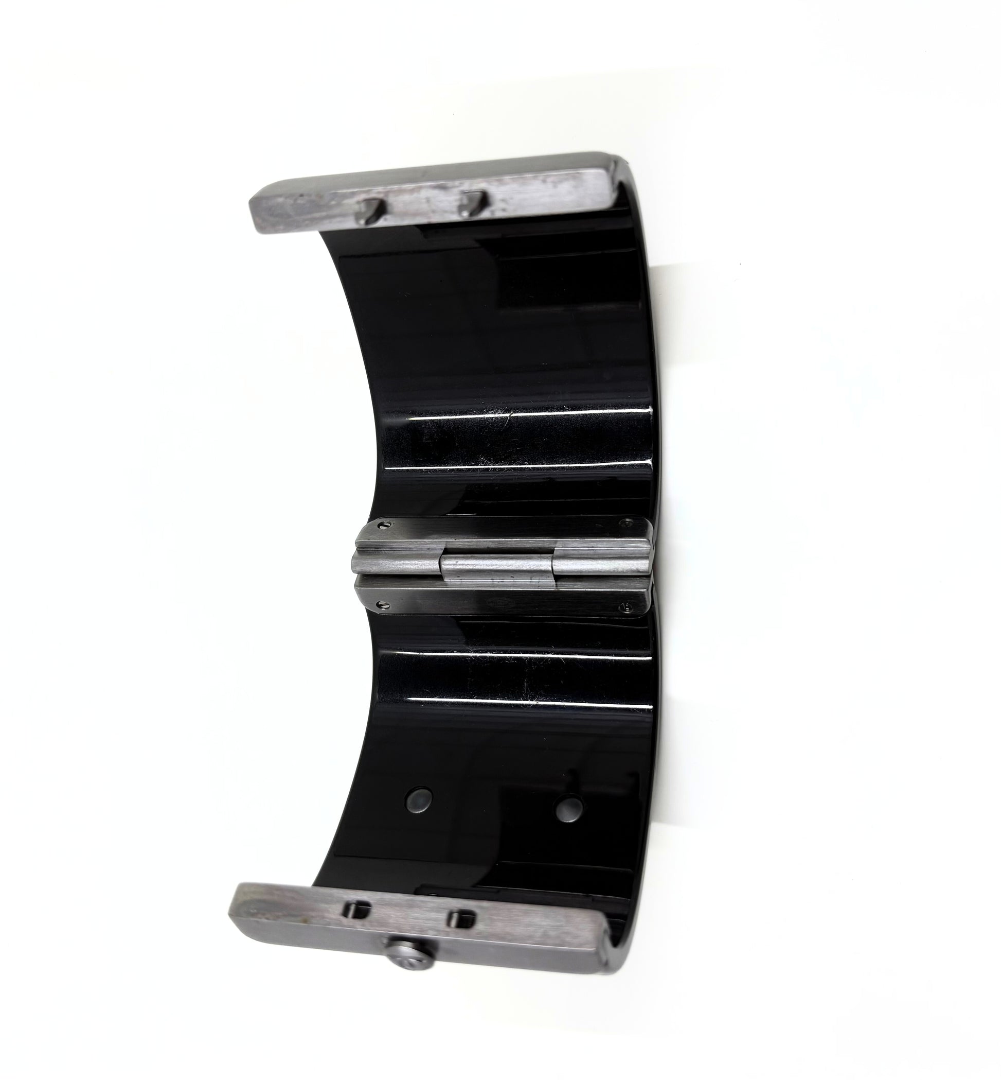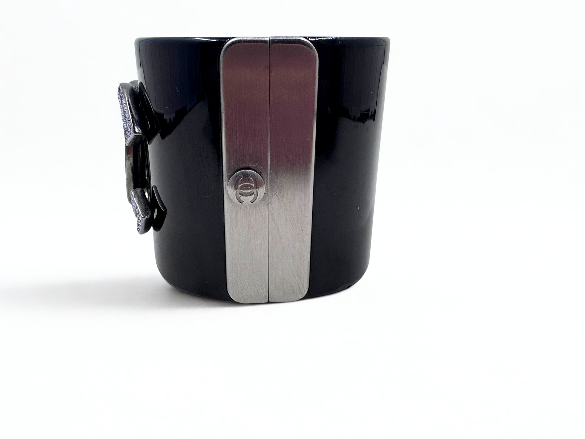 Stunning Chanel cuff bracelet in black resin featuring the brand’s logo in crystals. Palladium plated closure. Very good condition with minor marks on the back.