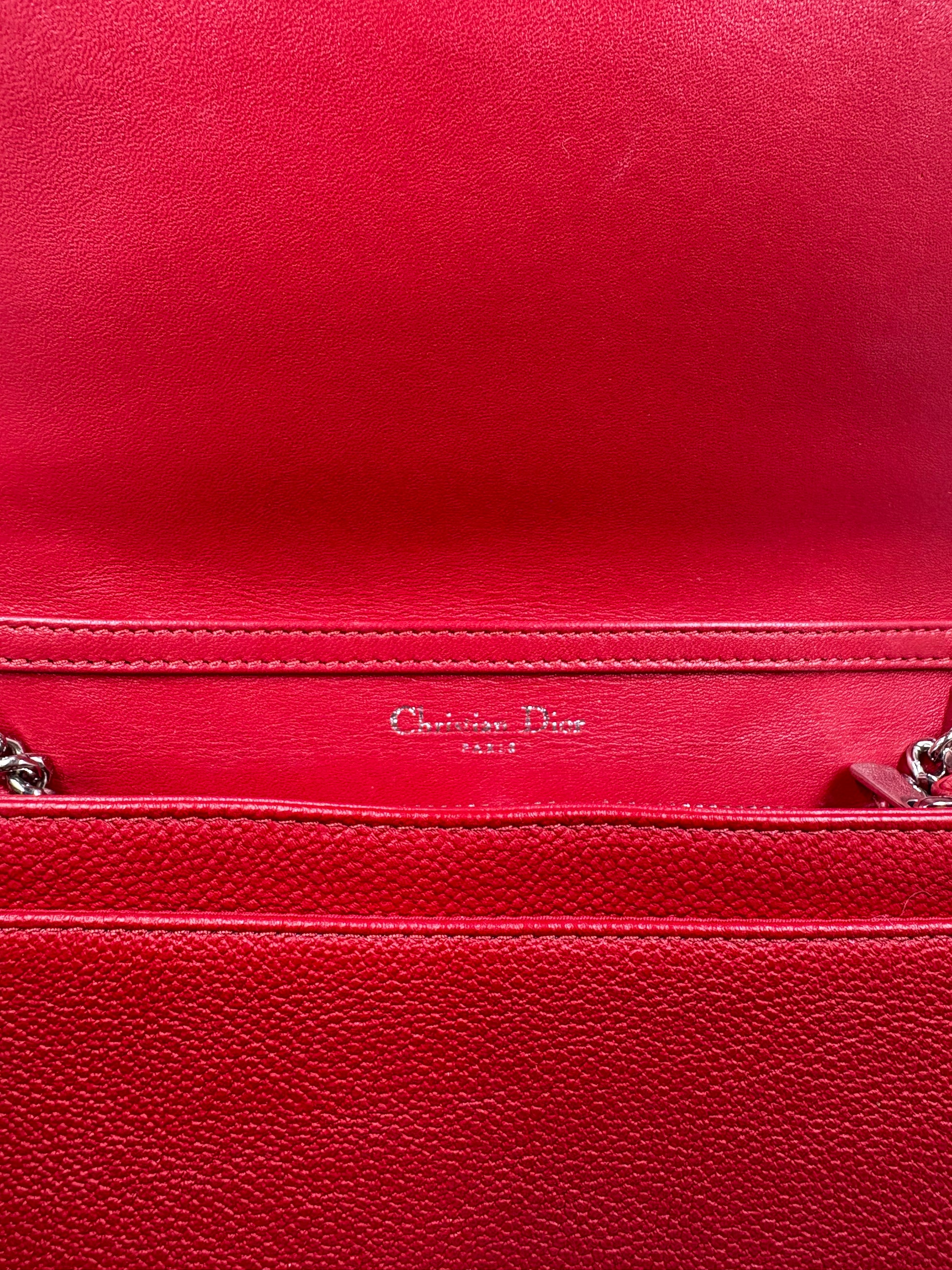 This stunning Diorama Wallet on Chain is crafted from smooth, geometrically quilted calfskin leather, accented with silver-tone hardware. It features a sleek chain-link m strap and signature Dior press-lock closure. The interior is lined in leather and includes multiple card slots and a zip pocket for essentials. Box, dust bag, tag, and certificate of authenticity included