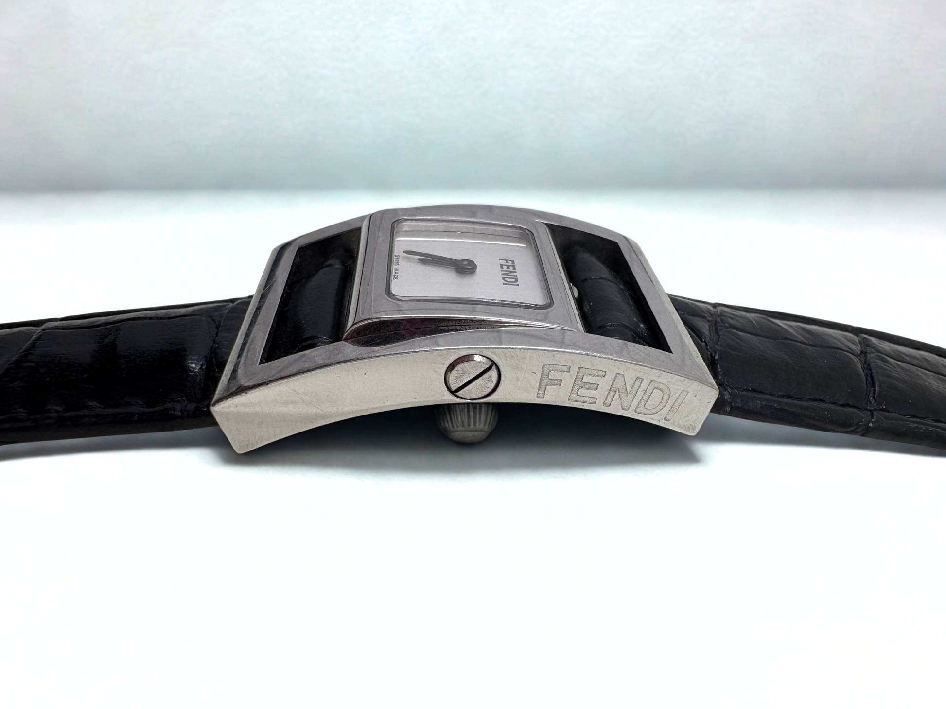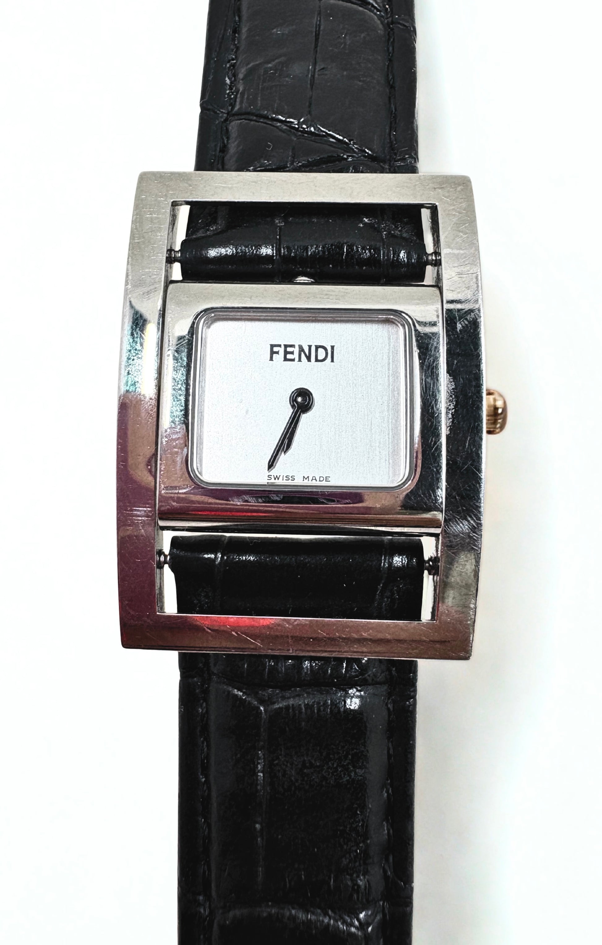 This vintage Fendi watch features a rectangular stainless steel face with a white dial and gorgeous leather strap. Swiss-made. Very good used condition with minor scratches on the stainless steel.