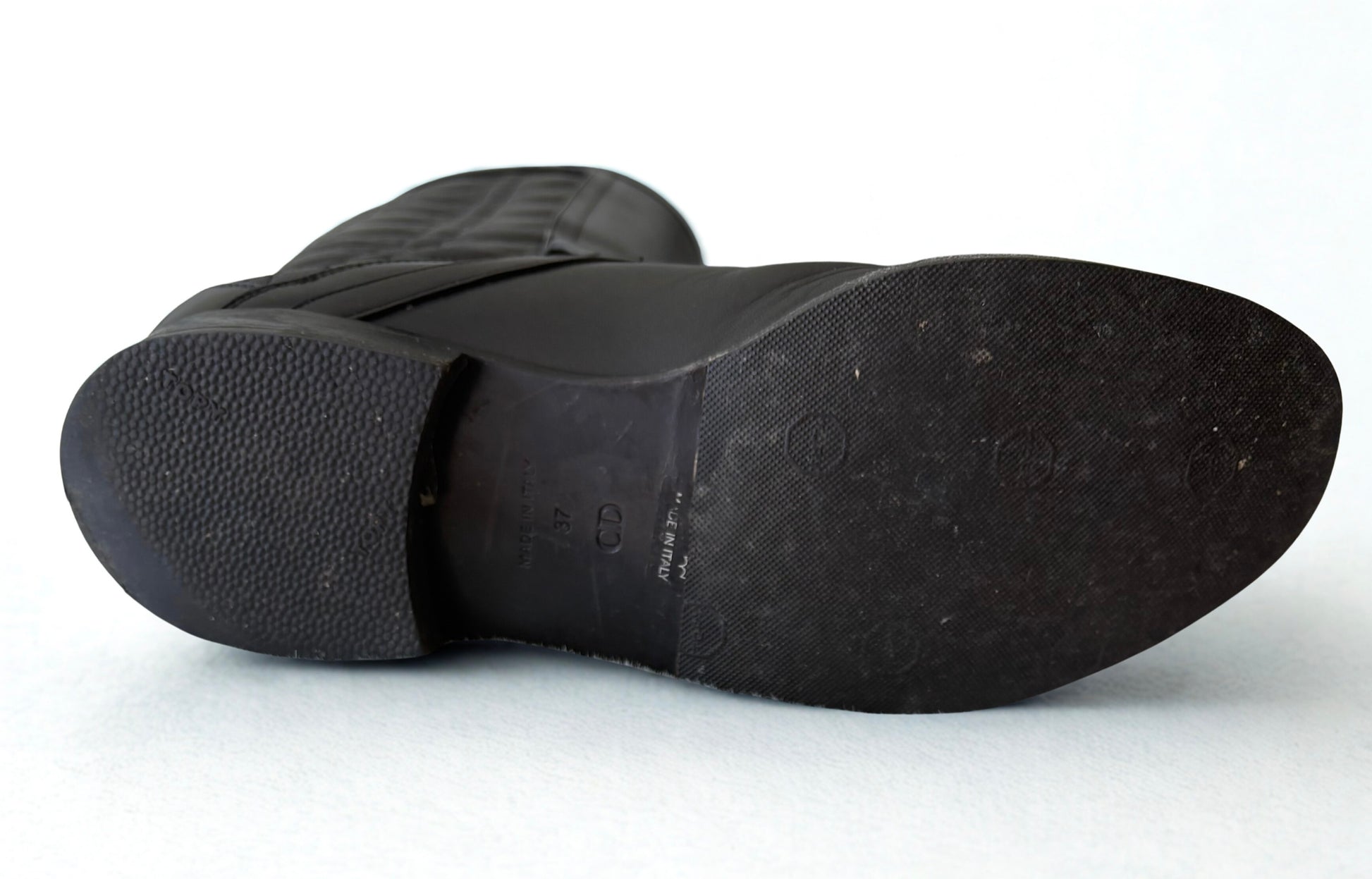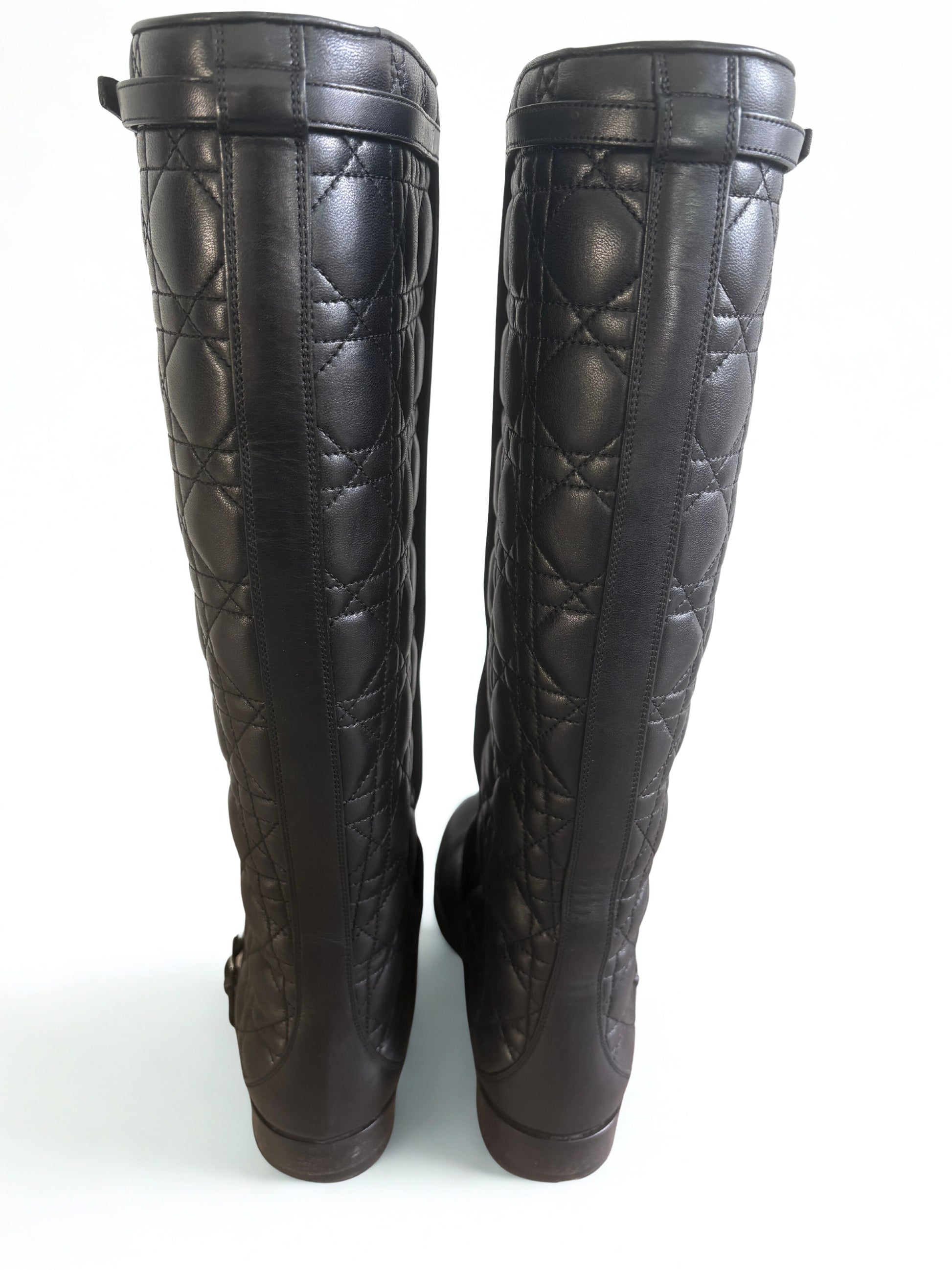 Dior Cannage Riding Boots crafted in smooth calfskin leather. Featuring a classic round toe silhouette and signature side buckle detailing. In very good condition with light creasing on the leather. Includes original dust bags. Heel height: 1”.